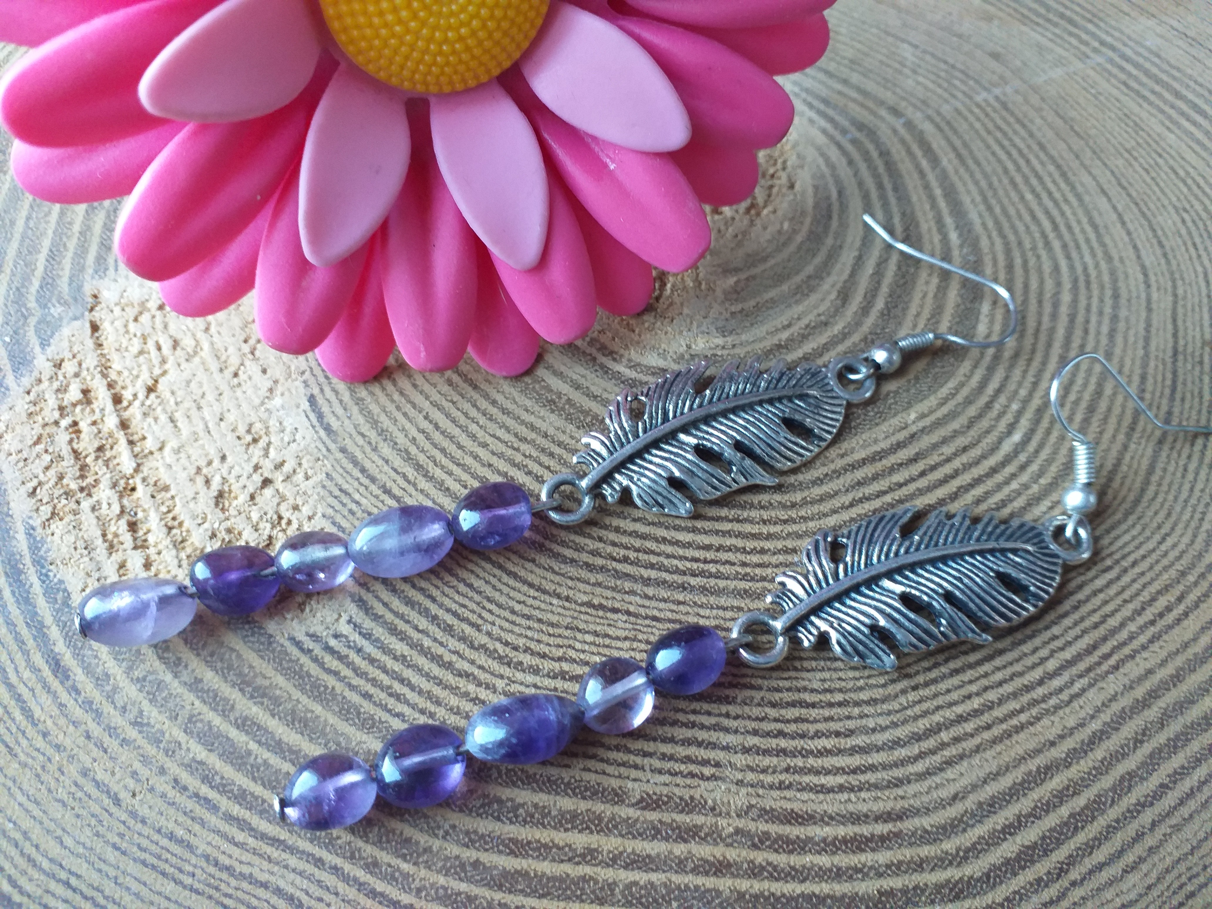 BOUCLES D'OREILLES pendantes Cascade en AMÉTHYSTE avec sa grande PLUME en métal